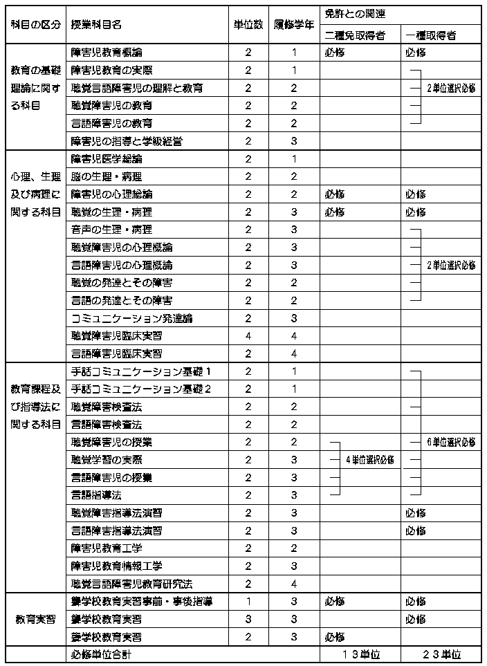 四年制学部の場合,卒業要件としての最低履修単位数が決められている。いわば,この単位を取得すれば卒業できますと言うラインである。通常,障害児教育教員養成課程の学生は,共通教育と呼ばれる以前の教養部または教養課程の単位の上に,小学校教諭免許状などの「基礎免」を取得する単位を取得し,さらに特殊教育関係の単位を取得して卒業することになる。