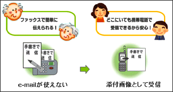 例えば,図のように携帯メールを持っていない,または使えない方が,聴覚障害の家族(子どもや孫)の携帯にメッセージを送りたいとします。今まではメールが使える携帯を持っている誰かに「メールを送って!」と頼まなくてはなりませんでした。しかし,手元にファックスがあれば,特定の番号にファックスを送信すると,ファックスに書いた内容(画像イメージ)が携帯にmail添付画像として送信されるというシステムです。